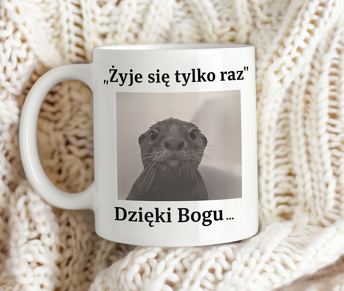 Kubek Mem „Żyje się tylko raz – Dzięki Bogu…” – humor egzystencjalny w płynnej formie.