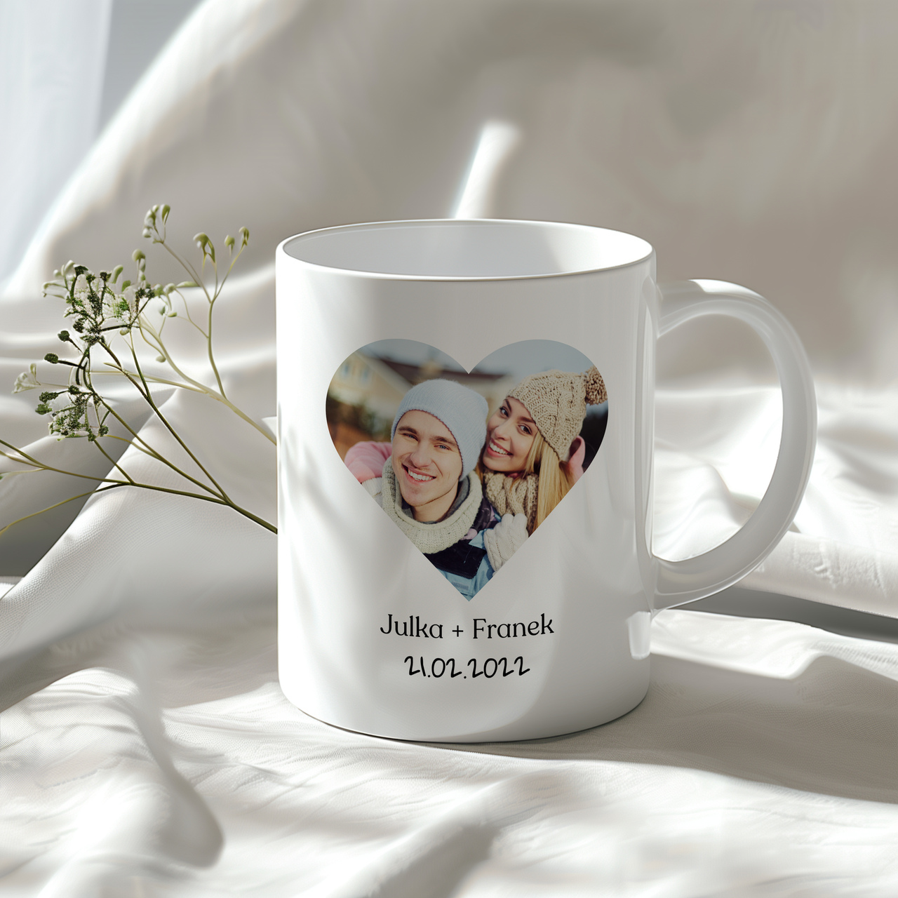 Personalizowany kubek ze zdjęciem w kształcie serca, imionami i datą to wyjątkowy sposób na stworzenie unikalnego upominku dla bliskiej osoby. Wykonany z wysokiej jakości ceramiki, zapewnia trwałość i wygodę użytkowania na co dzień. Pojemność 330 ml sprawia, że idealnie sprawdzi się do porannej kawy, popołudniowej herbaty czy innego ulubionego napoju.