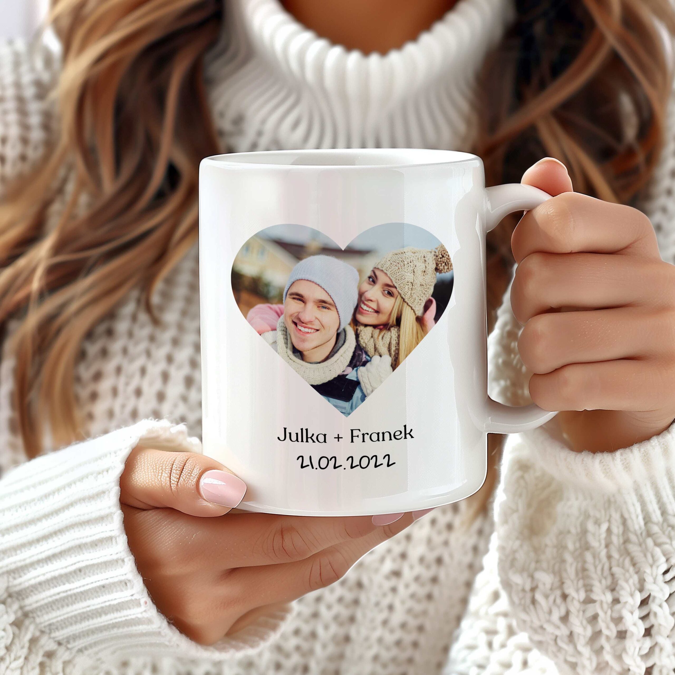☕ Kubek 330ml A+ – Elegancki kubek z nadrukiem Twojego zdjęcia w kształcie serca, daty oraz imion. Perfekcyjny do ulubionych napojów, przypomina o szczególnych momentach każdego dnia.