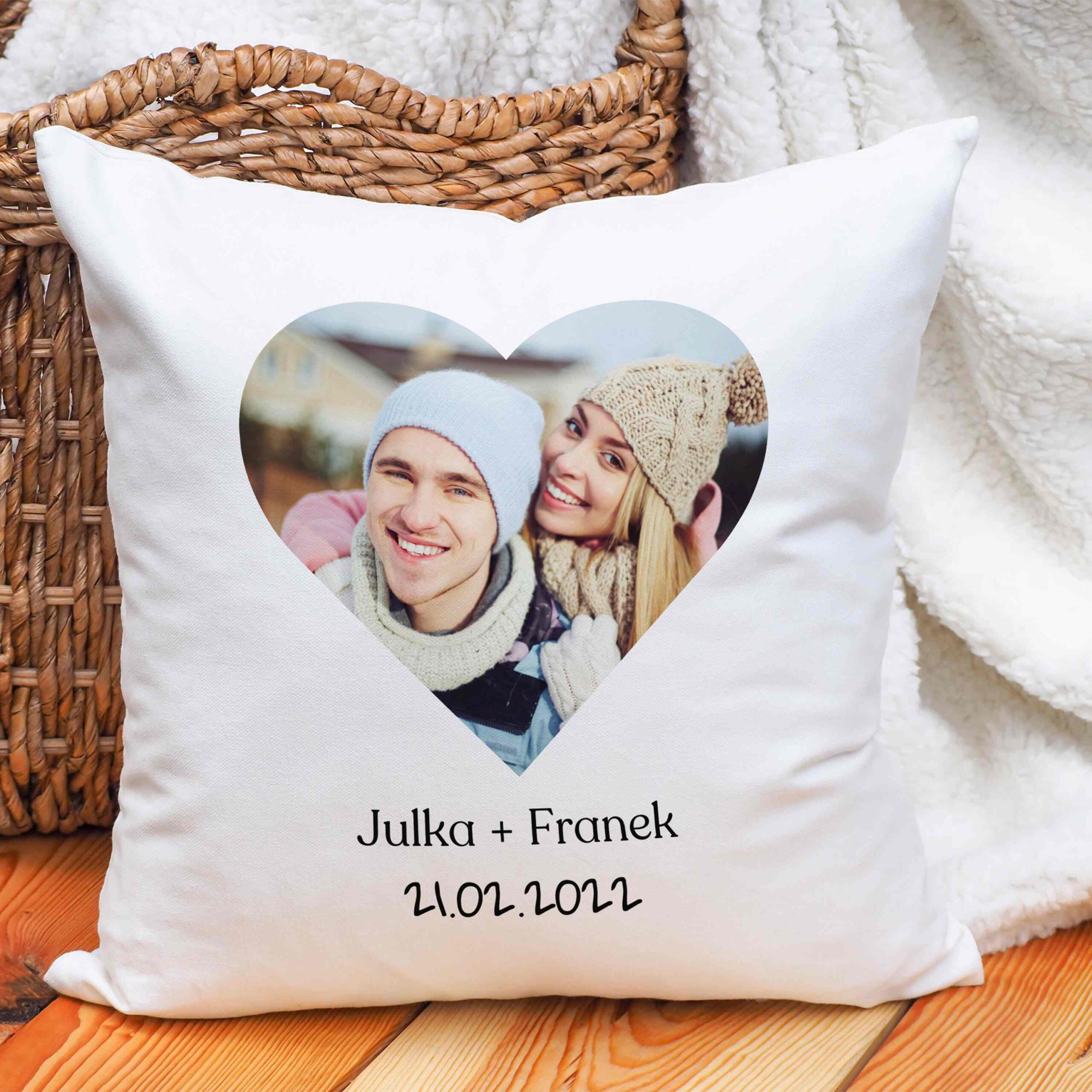 🛏️ Poduszka 40×40 cm – Miękka i przytulna poduszka z nadrukiem personalizowanego serca, daty oraz Waszych imion. Idealna jako dekoracja sypialni lub wyjątkowy dodatek do relaksu. W zestawie poszewka i wkład!