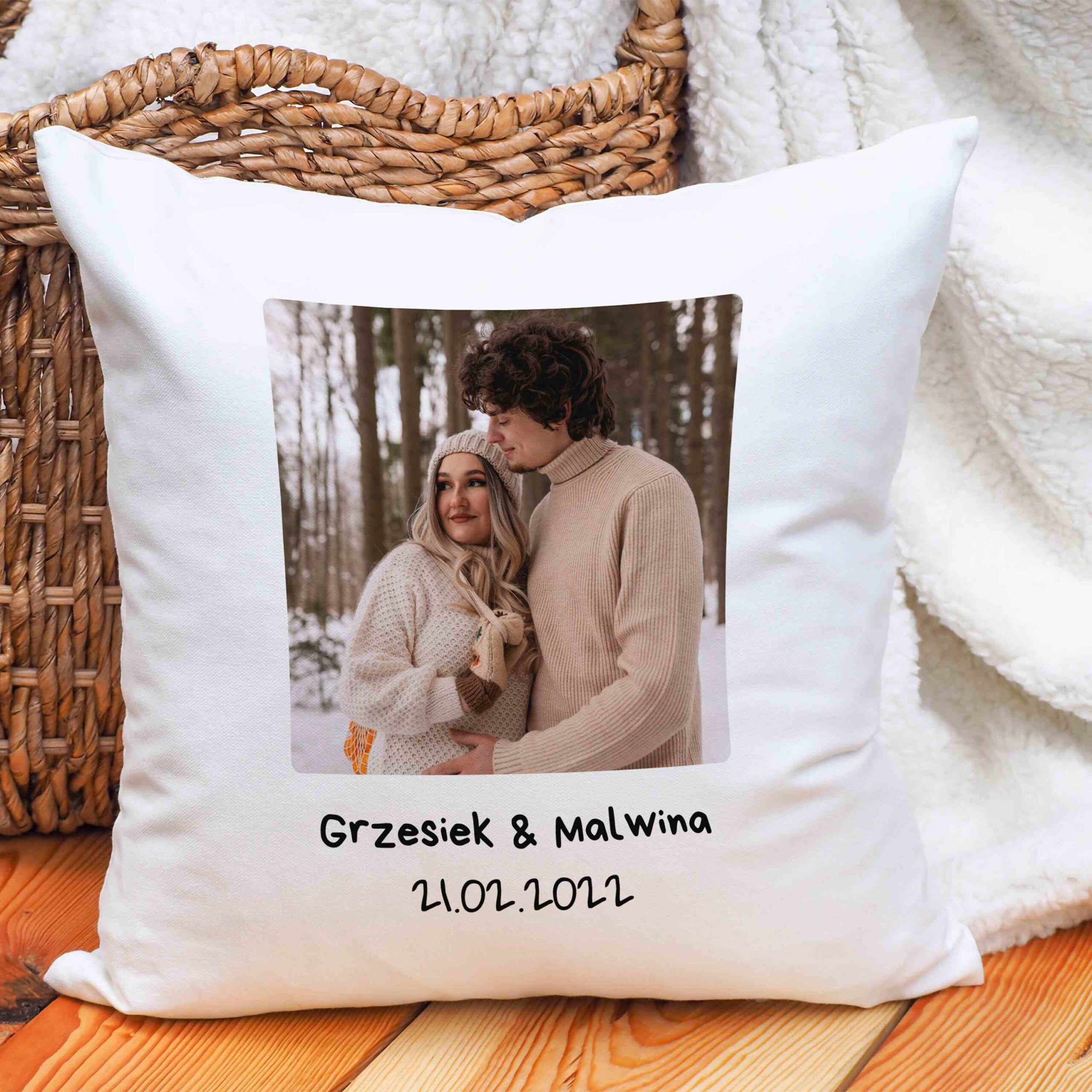 🛏️ Poduszka 40×40 cm – Miękka i przytulna poduszka z nadrukiem personalizowanego serca, daty oraz Waszych imion. Idealna jako dekoracja sypialni lub wyjątkowy dodatek do relaksu. W zestawie poszewka i wkład!