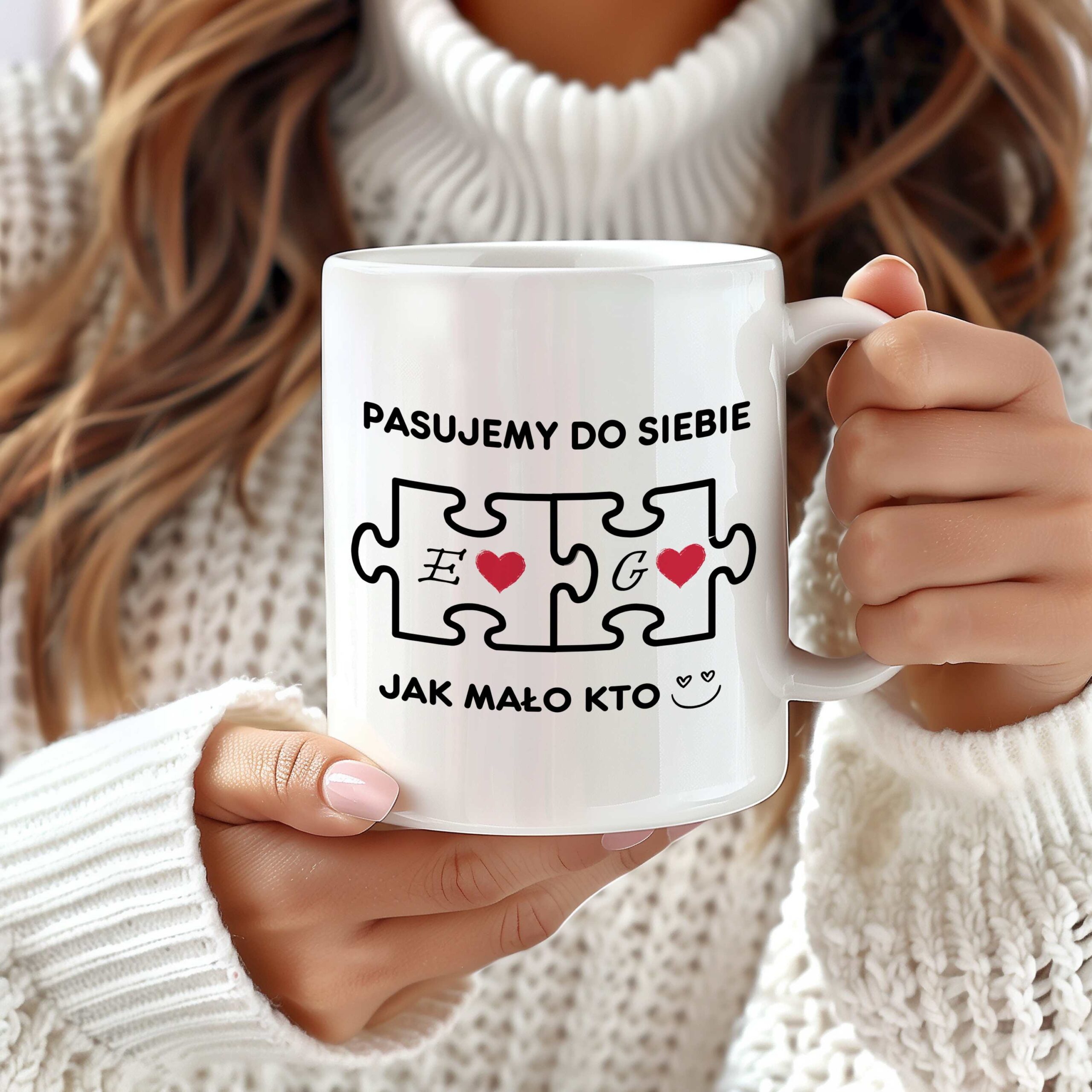 Kubek 330ml A+ – Stylowy i trwały kubek z nadrukiem personalizowanych inicjałów oraz motywem puzzli, które symbolizują idealne dopasowanie. Każdy łyk ulubionego napoju przypomni o Waszej wyjątkowej relacji.