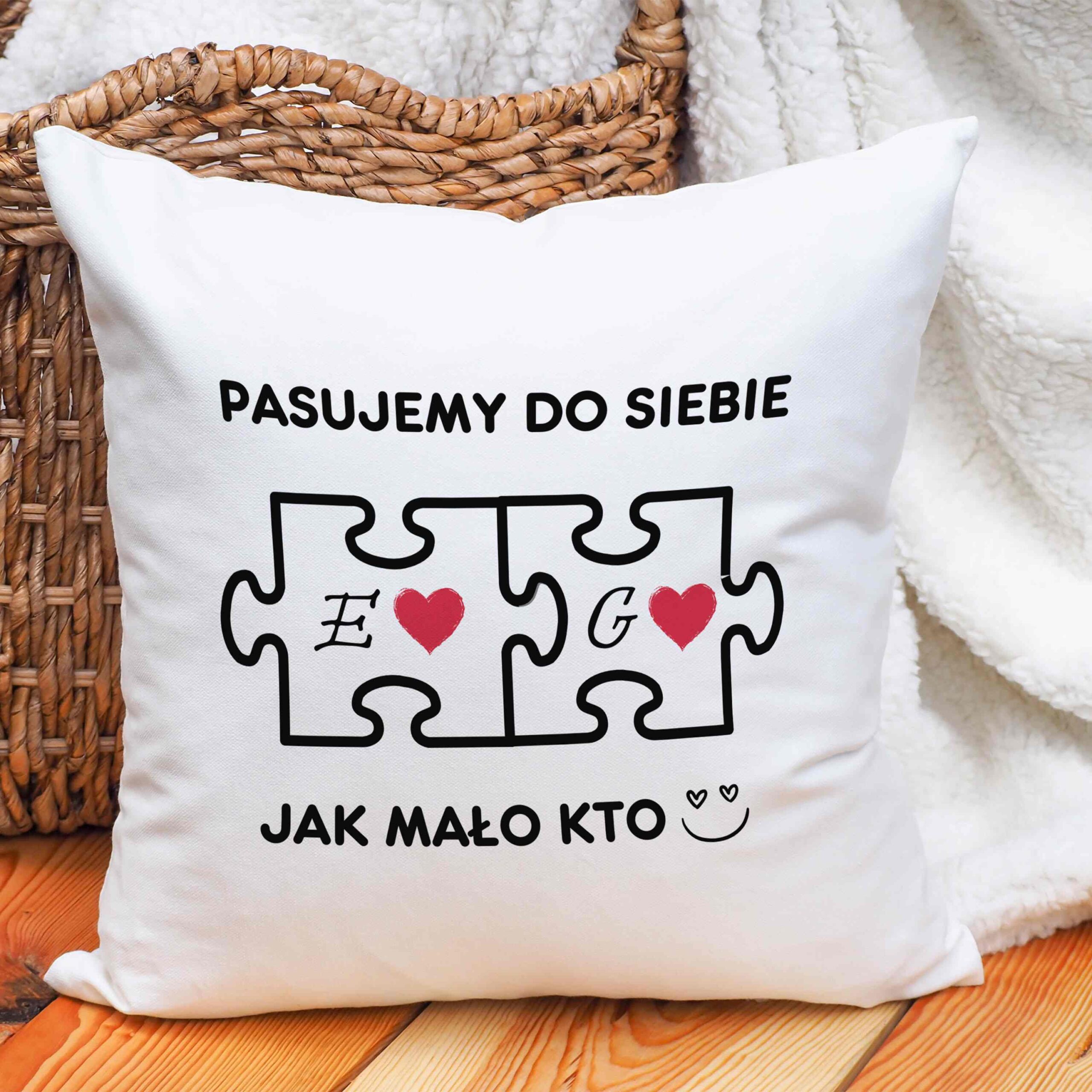 🛏️ Poduszka 40×40 cm – Miękka, przytulna i wypełniona miłością poduszka z nadrukiem pasujących puzzli, inicjałów oraz napisem „Pasujemy do siebie, jak mało kto”. To wyjątkowy dodatek, który ozdobi wnętrze i przypomni o bliskości.